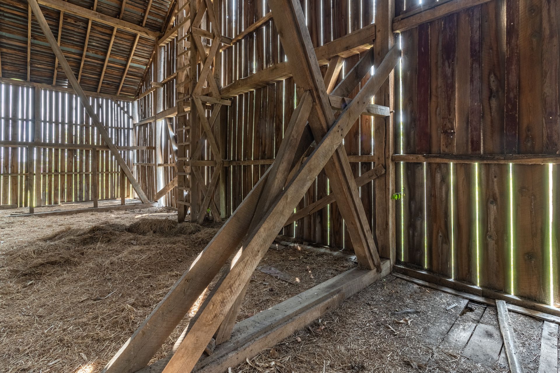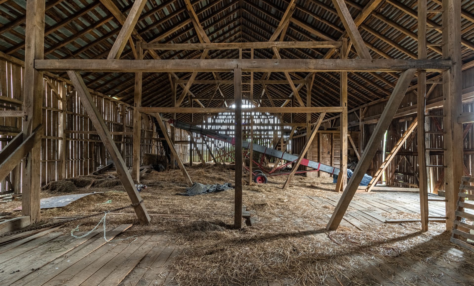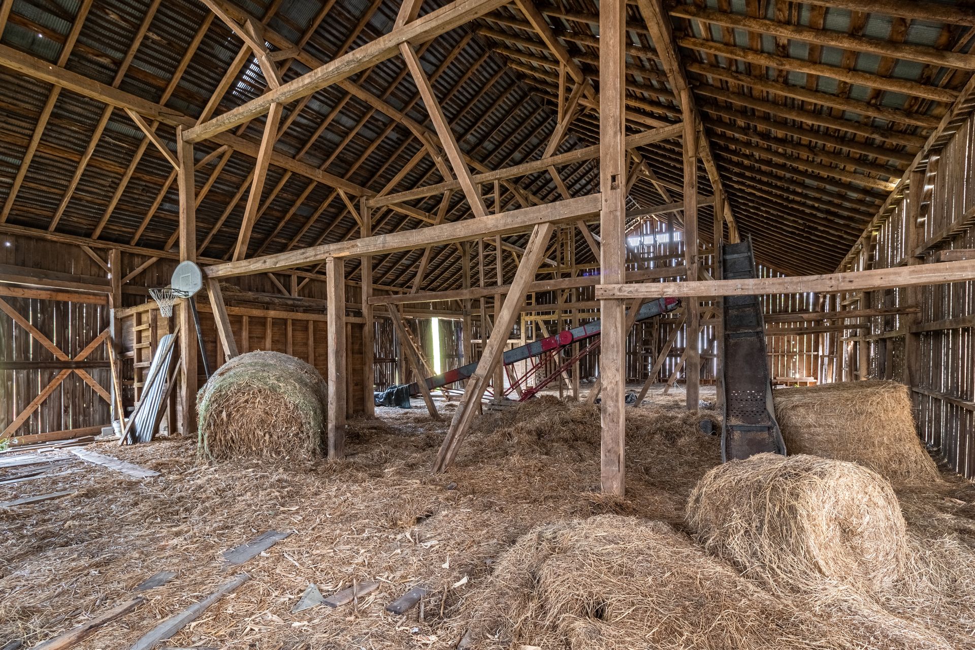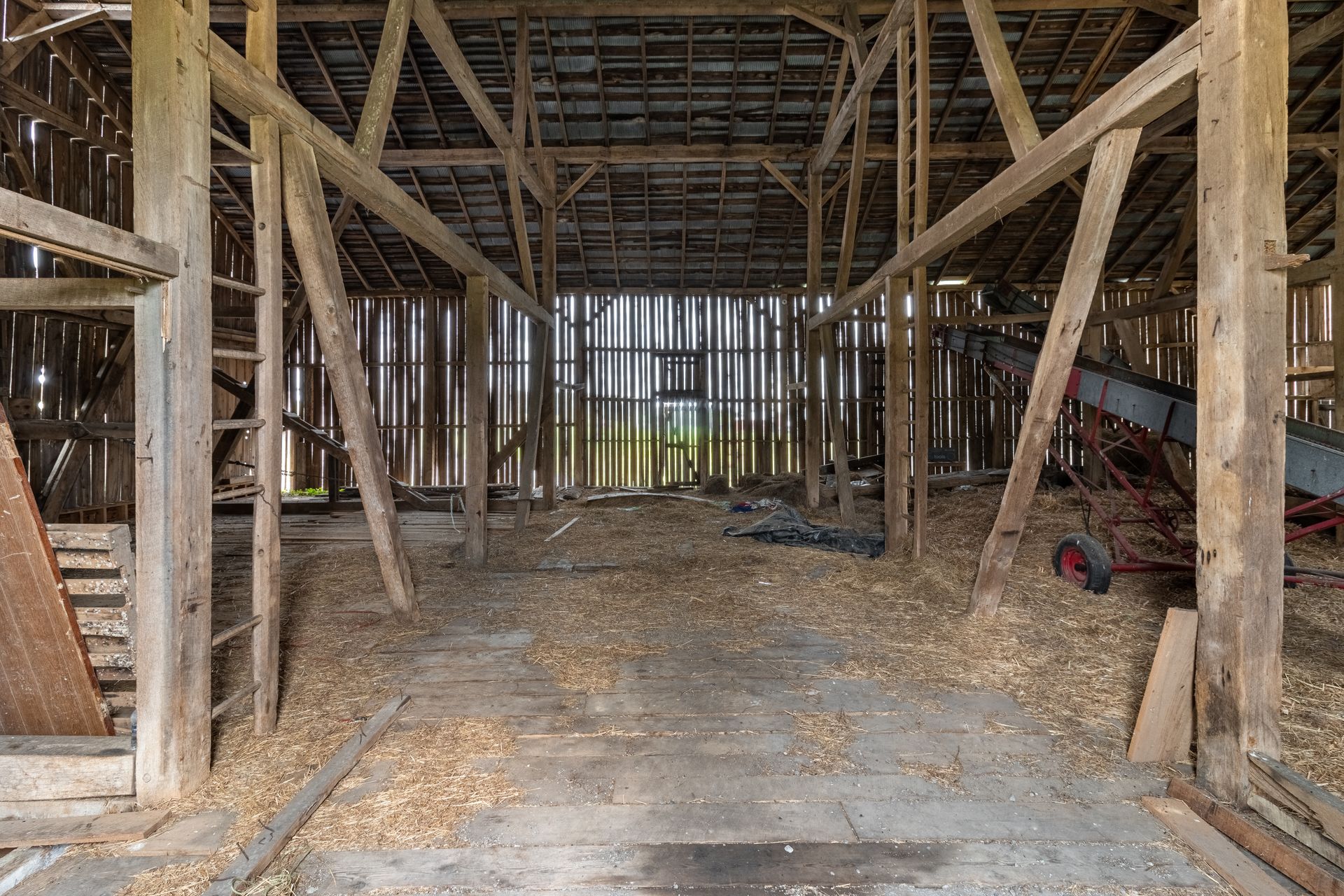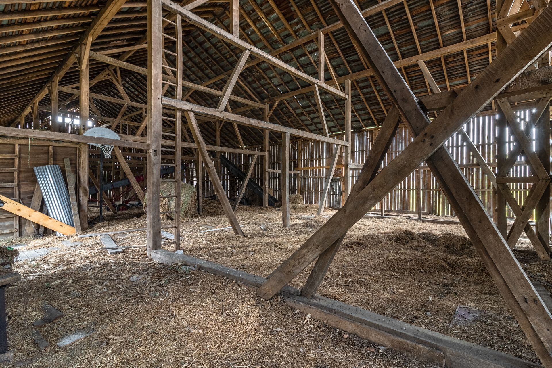Long beautiful frame. 11-foot off bays make a monitor barn an option. Large wind braces.