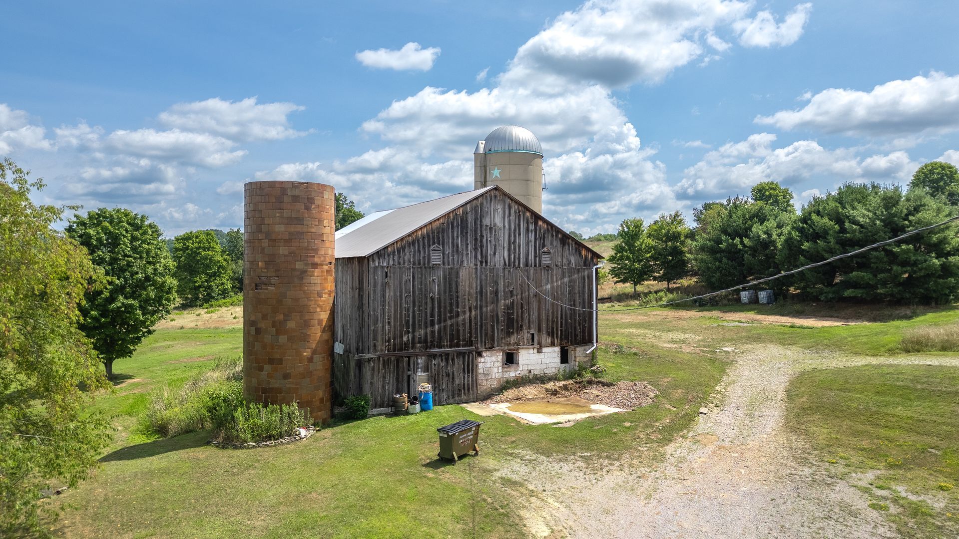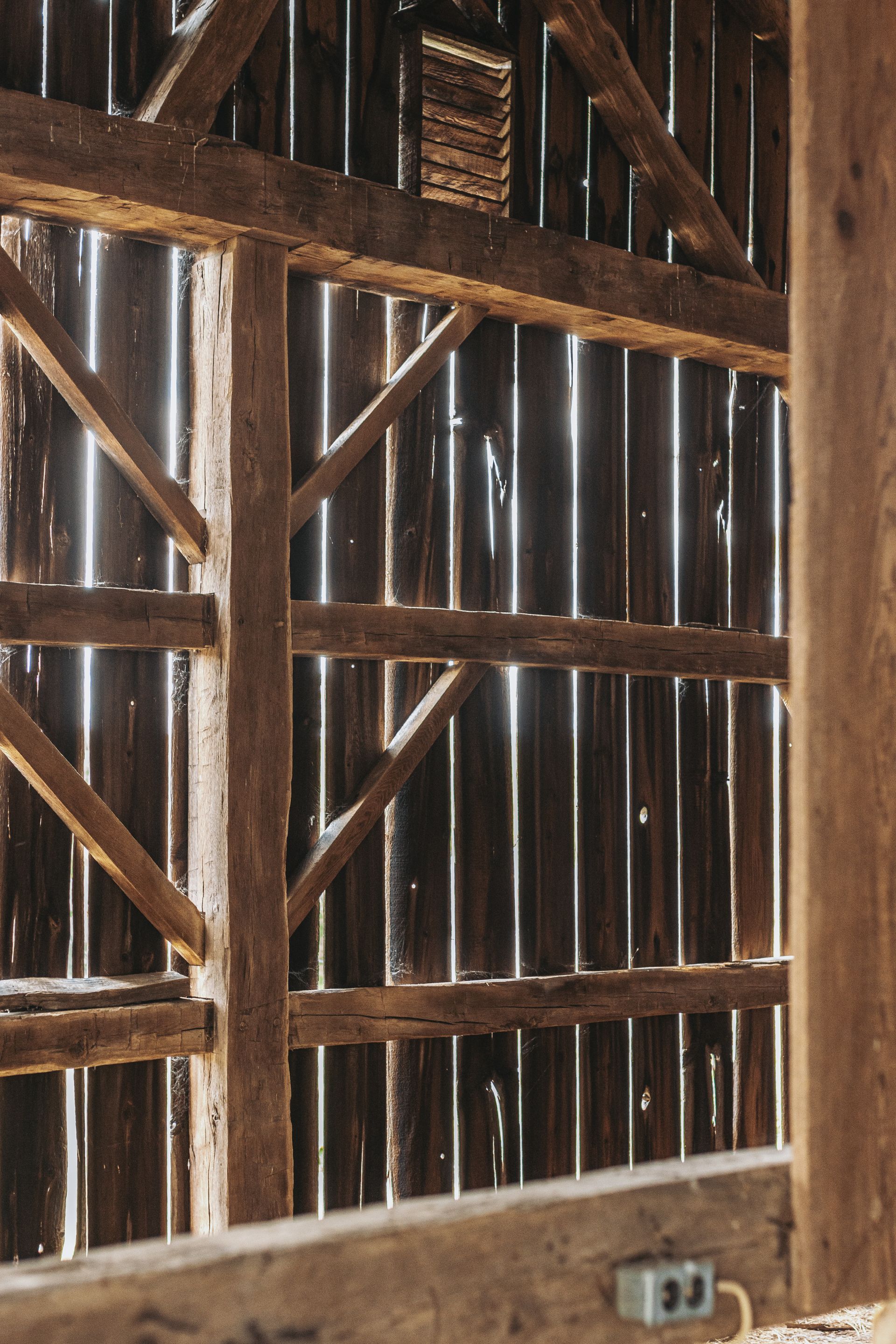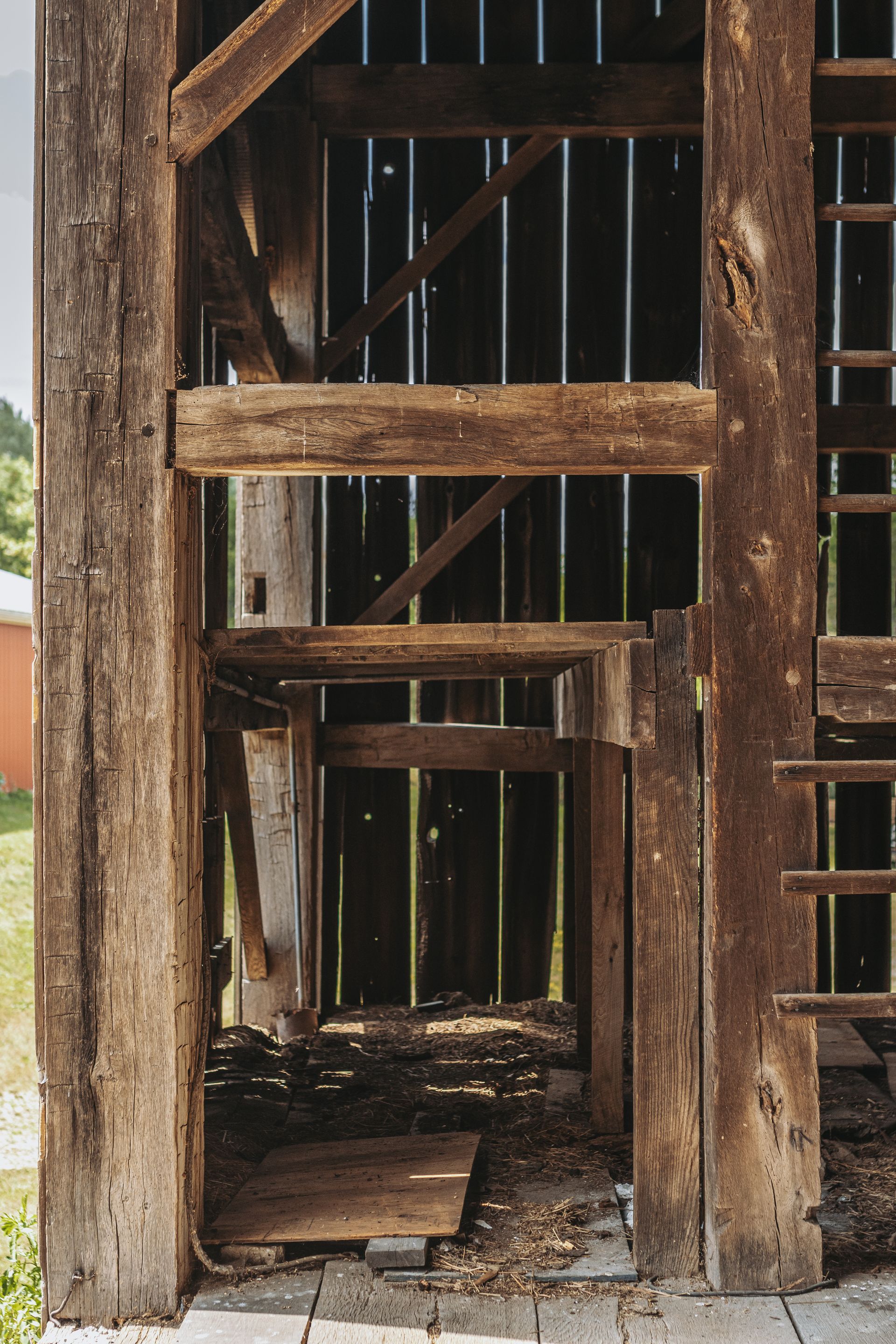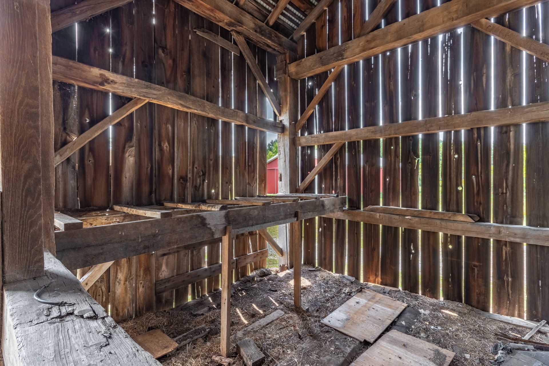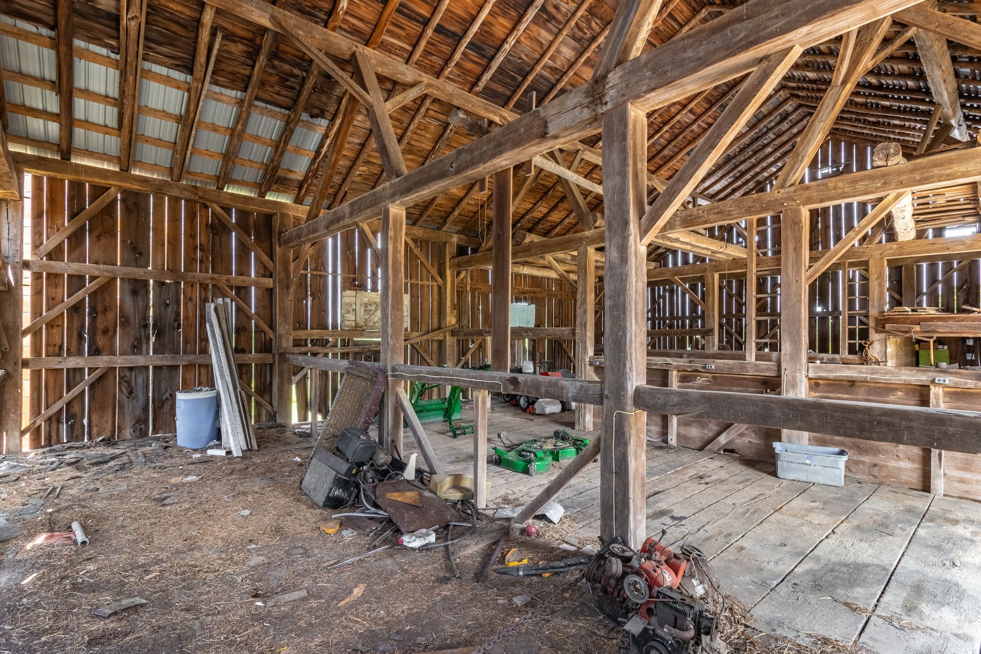 The barn's frame is made of hand-hewn timber meticulously joined to form a structure of undeniable strength and character. Its 5/4/variable bent/bay spacing reveals a design optimized for functionality and durability. While currently a single-story building, the barn's soaring roofline hints at the potential for a transformative loft conversion.